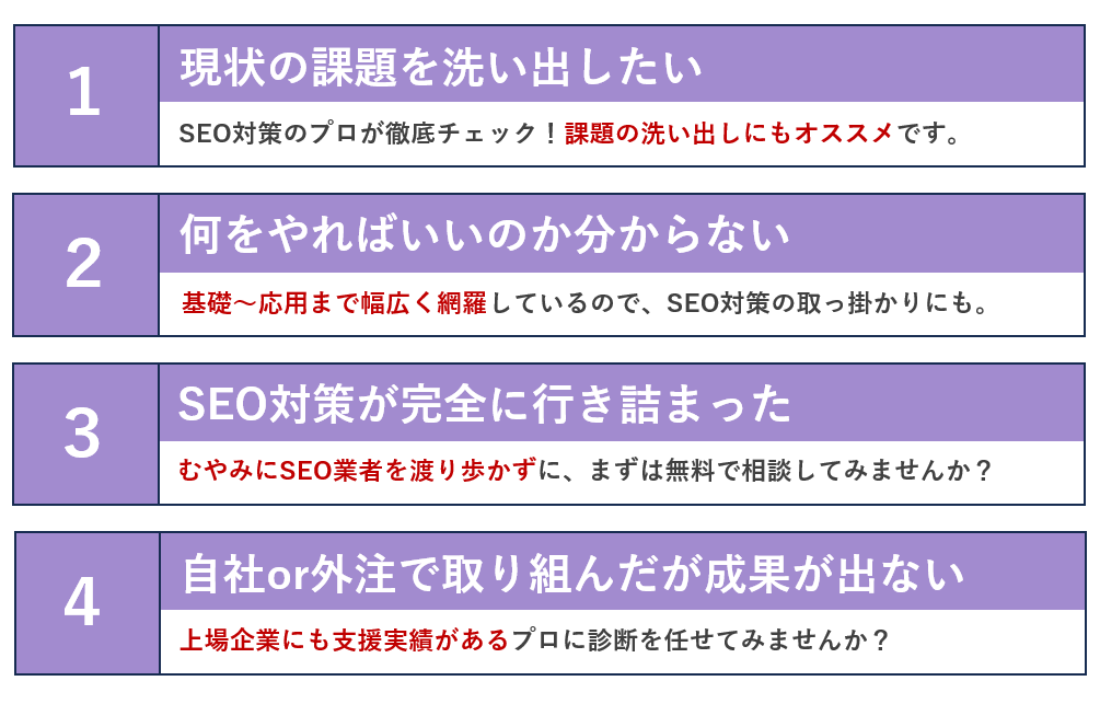 HOME >SEO無料診断お申し込みフォーム私たちが、あなたのSEOの“最終解”です。毎月10社限定|診断項目数・分析ボリューム業界トップクラス。「今」と「改善余地」がわかる、無料SEO診断を実施中!無料診断を受ける このような悩み、ありませんか? お申し込み~診断結果お伝えまでのながれ無理な営業は一切行いません無料診断後、こちらから強引に契約を迫ることはありません。診断結果をご覧いただいたうえで、「Ask Whiteなら任せたい」と感じていただけた場合のみ、次のご提案をさせていただきます。無料診断を受ける SEO無料診断お申し込みフォームご担当者様のお名前必須御社の会社名・施設名必須診断をご希望のWEBサイトURL必須ご連絡先:お電話番号必須ご連絡先:メールアドレス必須現在のご状況新規でSEO対策を検討している相見積もりを取っている業者乗り換えを検討している興味はあるが、検討段階何らかの理由でSEO対策に踏み出せない現状は特に考えていない診断形式オンライン会議形式(オススメ)無料診断資料のみ※「無料診断資料のみ」を選択された場合、メール・お電話等での質疑応答や内容説明は行っておりません。備考・伝えておきたいことこのページはreCAPTCHAによって保護されています。 2025年12月31日 author